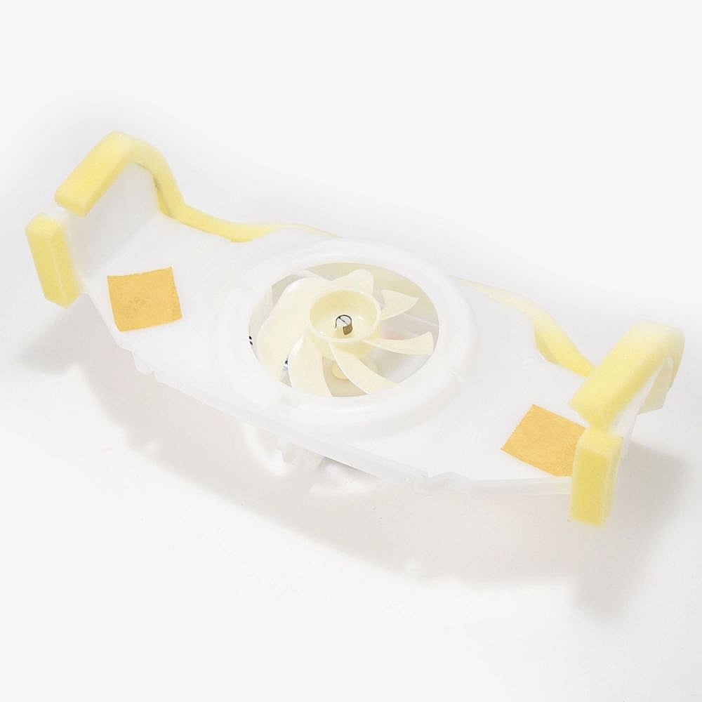 The evaporator fan motor circulates air through the fresh food compartment for efficient cooling and the bracket holds the fan motor in place.